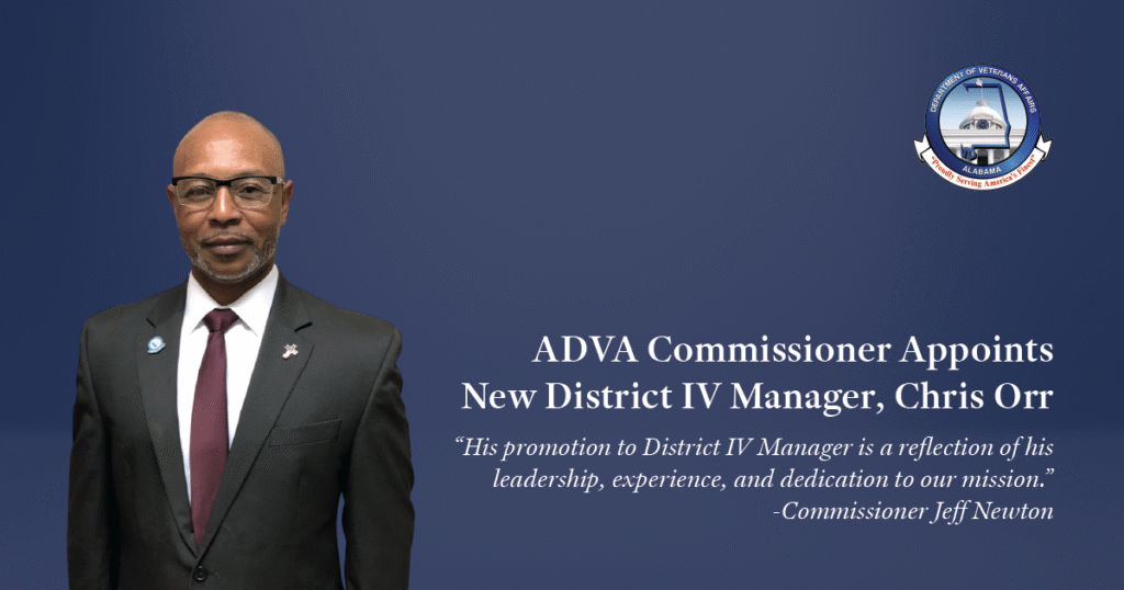 Alabama Department of Veterans Affairs (ADVA) Commissioner Jeff Newton has appointed Chris Orr to serve as the department’s new District IV Manager, overseeing veterans service offices across 15 counties in east-central Alabama.