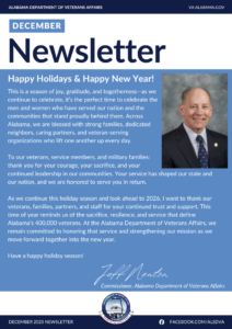 The Alabama Department of Veteran Affairs Monthly Integration Newsletter is now available for download. For your convenience, the ADVA has provided a PDF version of our newsletters below. By clicking the thumbnail, you can download, view, and print this year’s ADVA Newsletter issues.