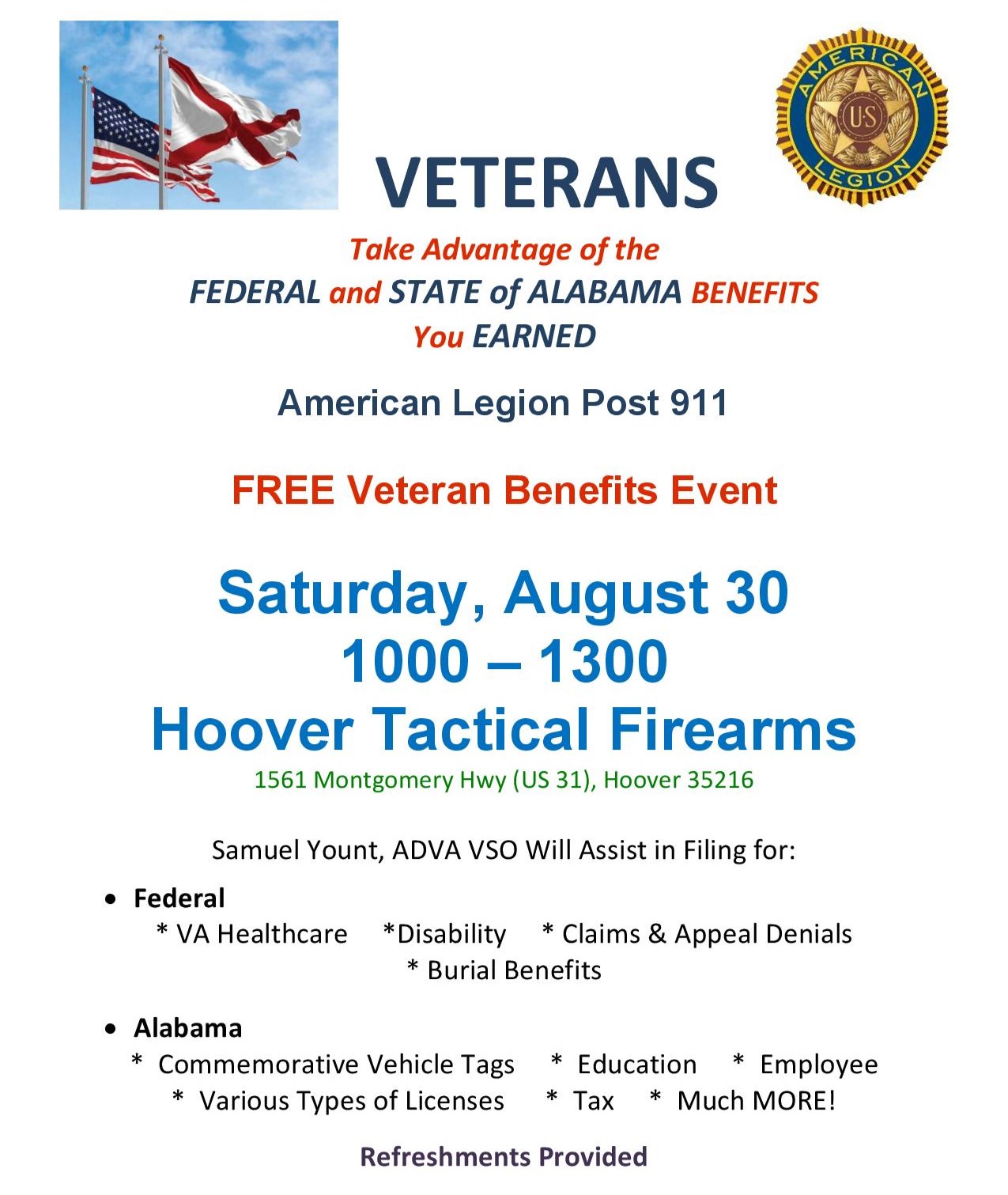 American Legion Post 911 Member & ADVA VSO VA Benefits Event + Add to Google Calendar + iCal / Outlook export Date Aug 30 2025 Expired! Time 10:00 am - 2:00 pm Location Hoover Tactical Firearms 1561 Montgomery Hwy (US 31), Hoover, AL Category Event Share this event