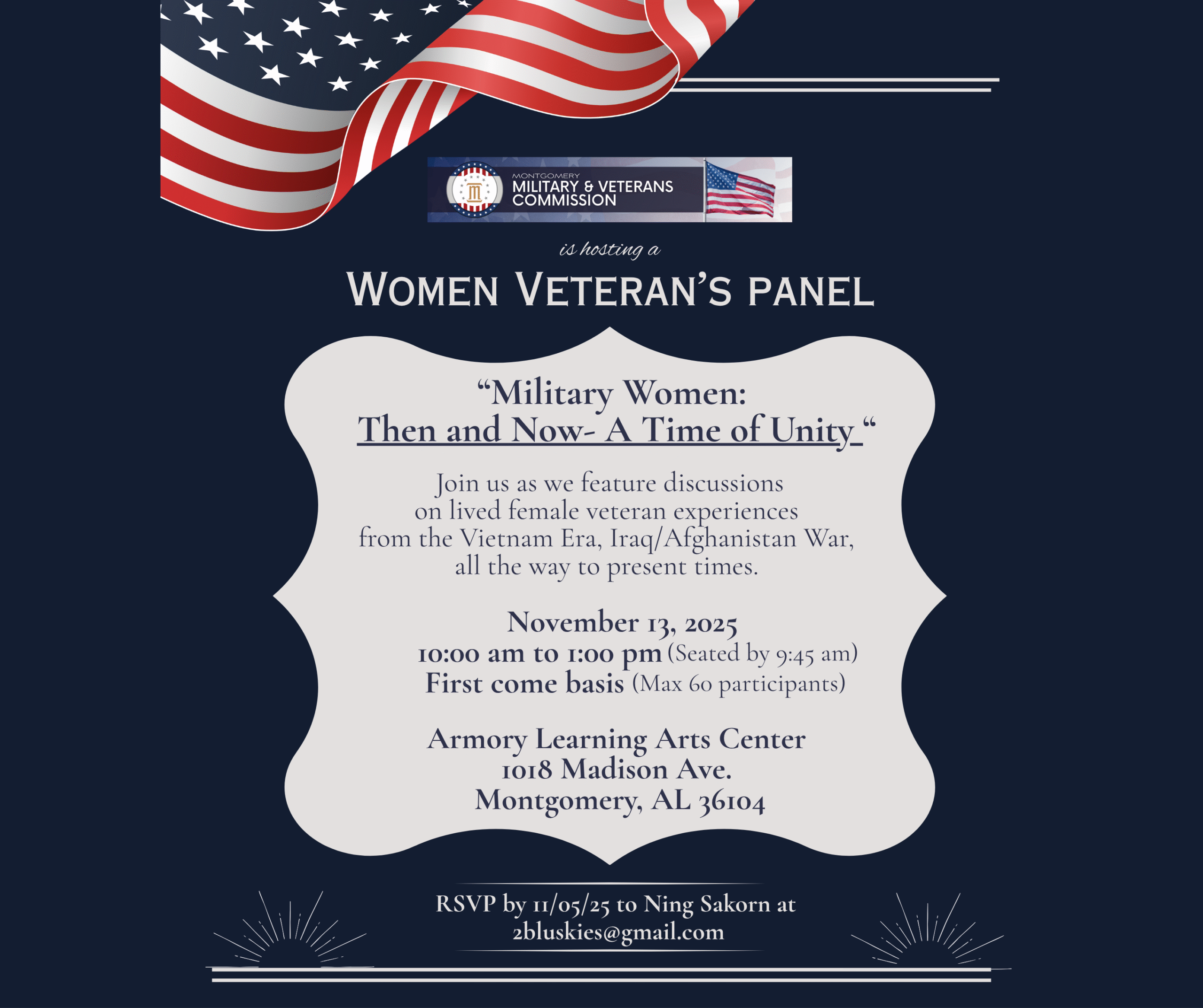“Join us as we feature discussions on lived female veteran experiences from the Vietnam Era, Iraq/Afghanistan War, all the way to present times. This is on a first come basis with a max of 60 participants. RSVP by 11/05/25 to Ning Sakorn at 2bluskies@gmail.com”