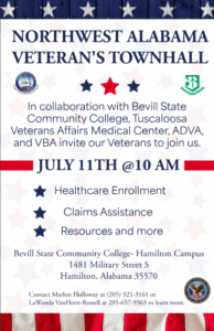Northwest Alabama Veteran’s Townhall + Add to Google Calendar + iCal / Outlook export Date Jul 11 2025 Expired! Time 10:00 am Location Bevill State Community College - Hamilton Campus 1481 Military Street S, Hamilton, AL Category Event Share this event