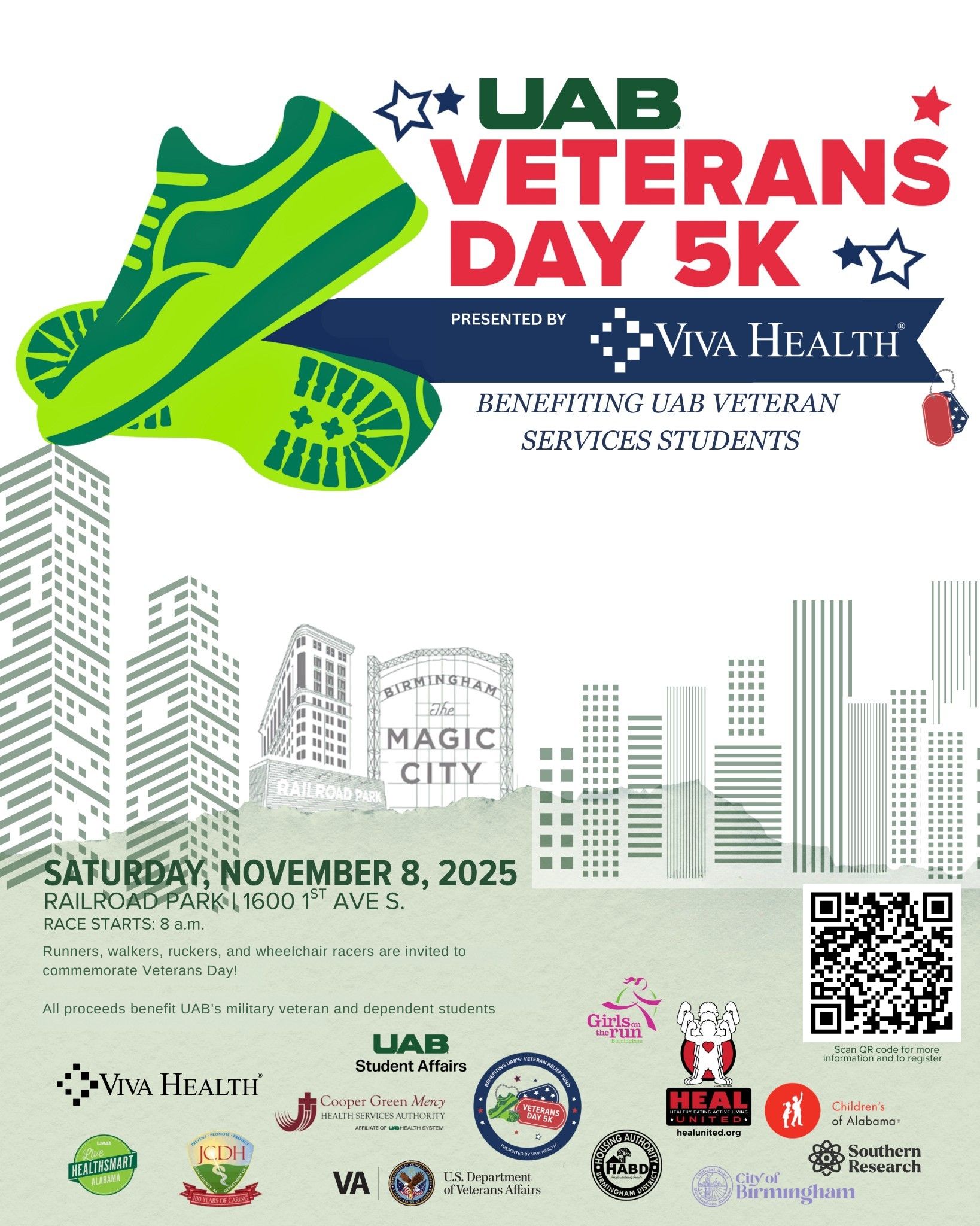 You can register at the QR code in the image or at: UAB Veterans Day 5k Presented By Viva Health