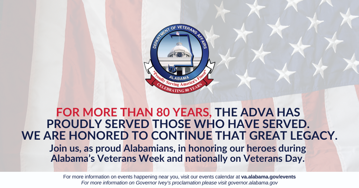“Veterans Week in Alabama is a reflection of all we owe to those who’ve served,” said ADVA Commissioner Jeff Newton. “I’m grateful to Governor Ivey, the Alabama Legislature and communities across our state for their shared appreciation and united commitment to honoring our heroes. Together, we’re ensuring that Alabama remains a place where veterans are valued, supported and never forgotten.”